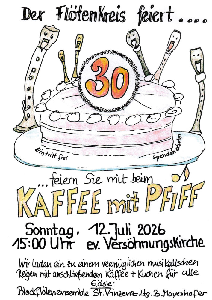 Die Feier beginnt um 15 Uhr in der Versöhnungskirche mit einem etwa einstündigen Konzert mit Textbeiträgen. Unterstützt wird der Flötenkreis von Vinzenz aus Erding.